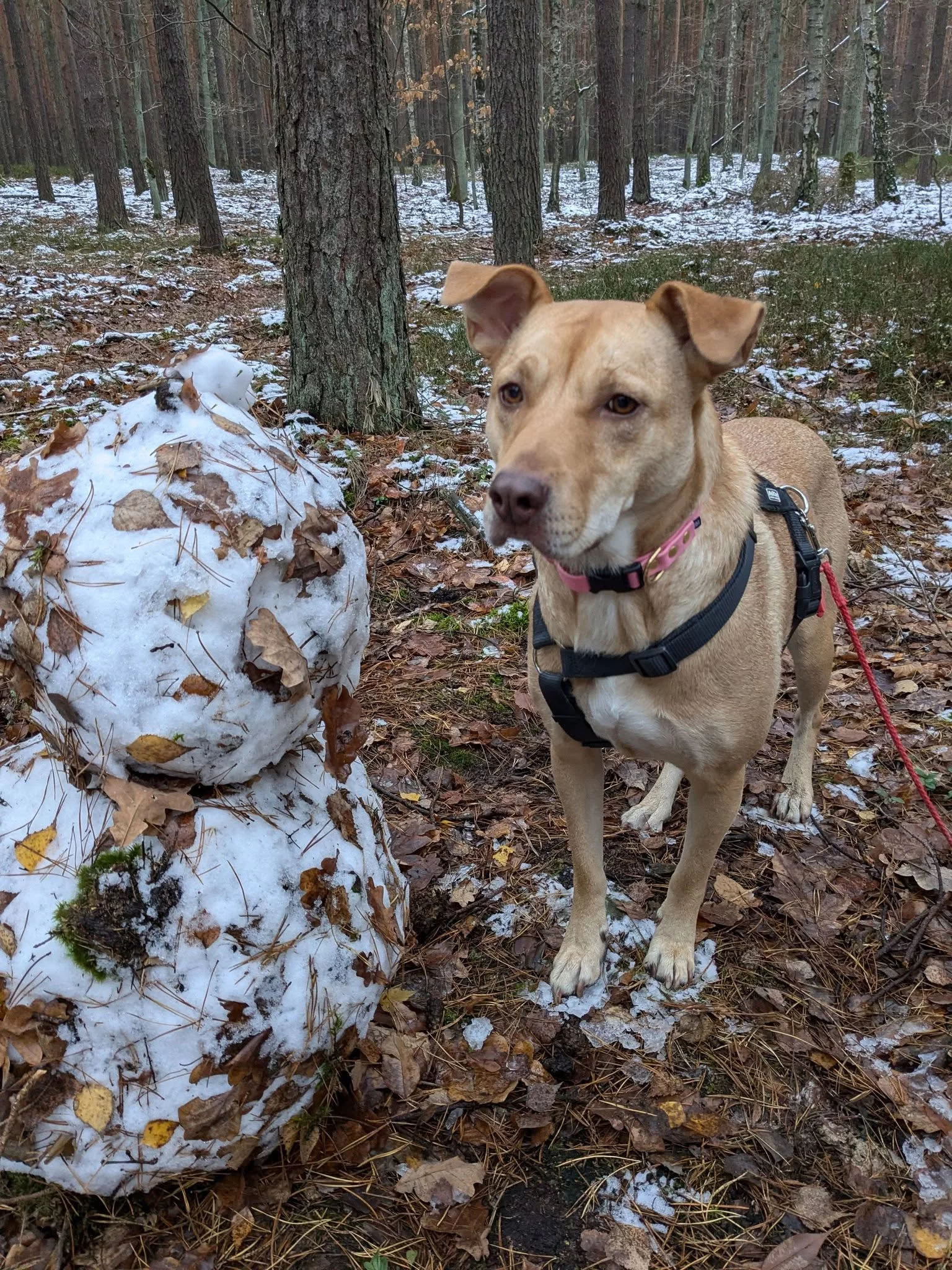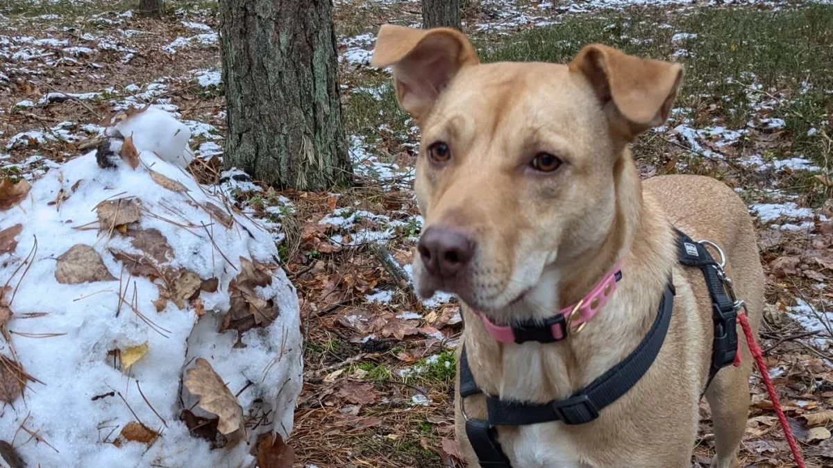Suczka ma czerwoną obrożę i czerwoną lampeczkę na szelkach. Pod postem o poszukiwaniach, ktoś, w komentarzu napisał, że podobnego zwierzaka widział, gdy przebiegał Puławską.