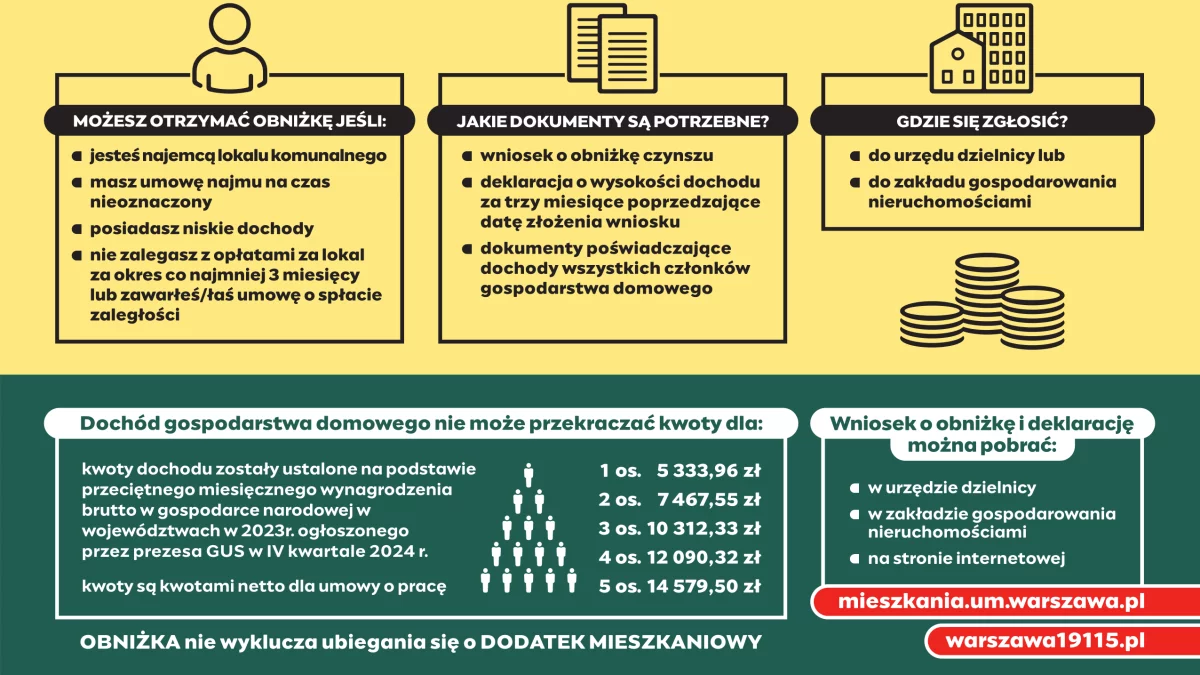 Wniosek o obniżkę czynszu, deklaracja o wysokości dochodu za trzy miesiące poprzedzające datę złożenia wniosku, plus dokumenty poświadczające dochody wszystkich członków gospodarstwa domowego.