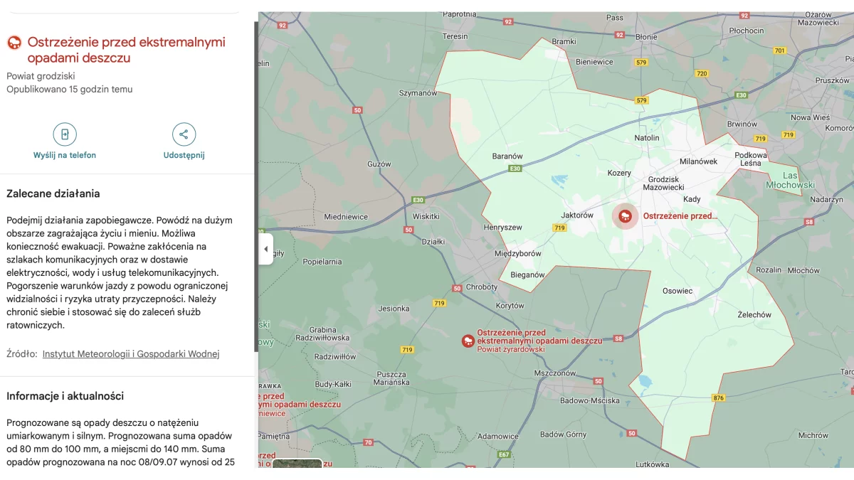 Wiadomości WarszawaNa mapach Google pojawił się pogodowe alerty dla regionu Warszawy. To ostrzeżenie przed ekstremalnymi opadami deszczu w powiatach Grodzisk Mazowiecki, Żyrardów i Skierniewice.