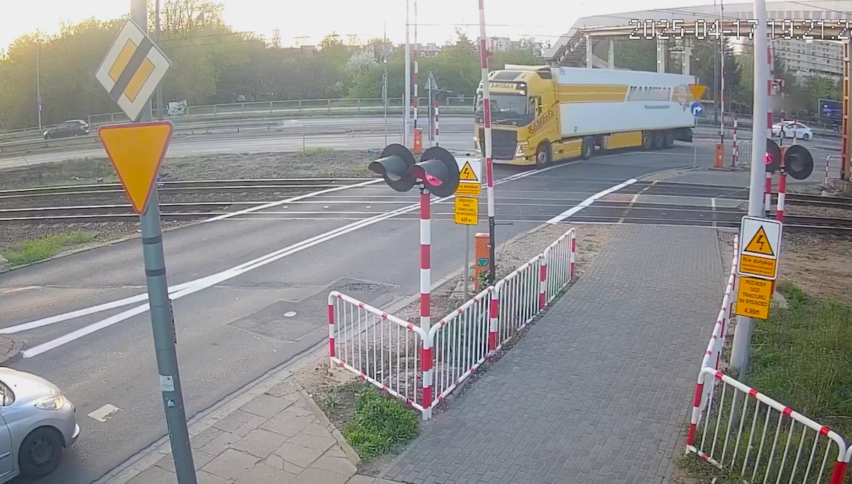 To cud, że nie doszło do tragedii! Na przejeździe kolejowym przy ul. Naczelnikowskiej w Warszawie zawodowy kierowca ciężarówki wjechał na tory, lekceważąc czerwone światło, alarm dźwiękowy i opadające rogatki. Zachował się tak, jakby miał prawo jazdy z chipsów, a nie z WORD-u.