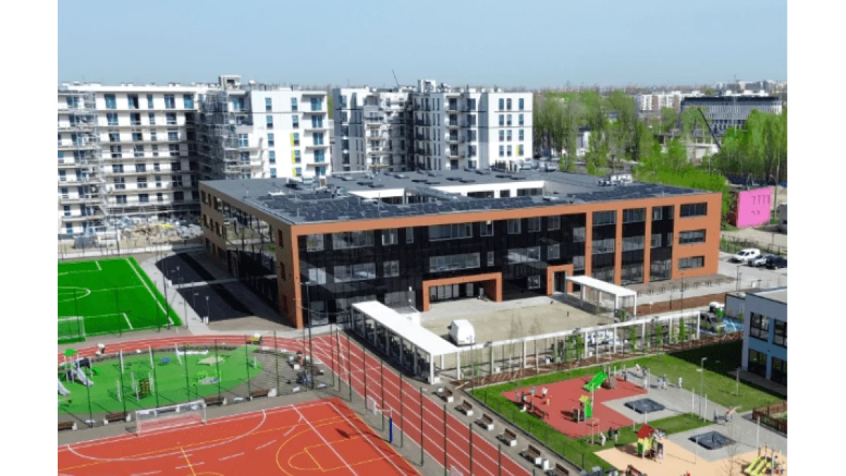 Nowy budynek szkolny zaprojektowany został dla 700 uczniów, łącząc w sobie nowoczesność, ekologię i funkcjonalność. Trzykondygnacyjny obiekt będzie zarządzany inteligentnym systemem BMS (Building Management System), który automatycznie administruje wszystkimi instalacjami, zarówno wewnątrz, jak i na zewnątrz. Dbałość o środowisko przejawia się w zastosowaniu odnawialnych źródeł energii.Na dachu oraz elewacji umieszczono dwa niezależne systemy fotowoltaiczne. Dzięki dwóm wydajnym pompom ciepła, wspieranym przez 50 odwiertów o głębokości do 100 metrów, szkoła sama wyprodukuje nie tylko energię elektryczną, ale również ciepło i ciepłą wodę użytkową.