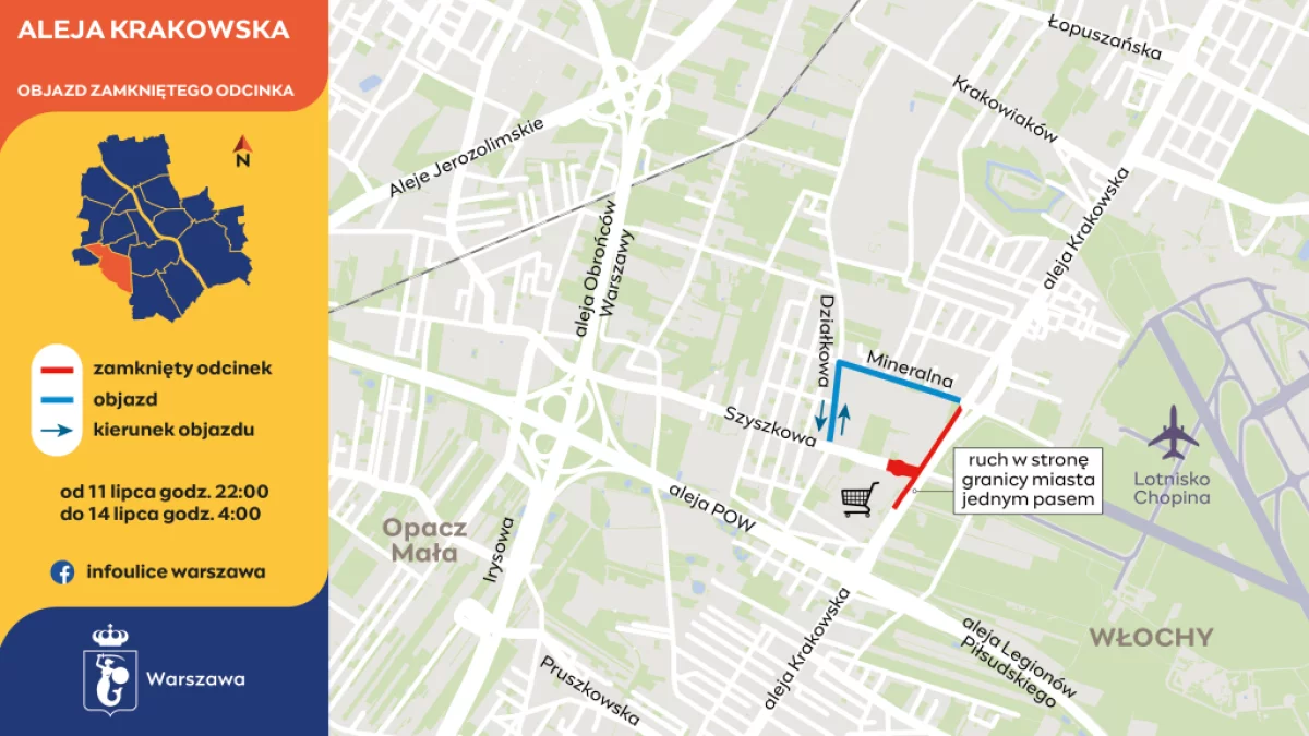 - Nie będzie możliwości skrętu z alei Krakowskiej w Szyszkową dla jadących od strony POW. Objazd poprowadzi ul. Mineralną i Działkową.