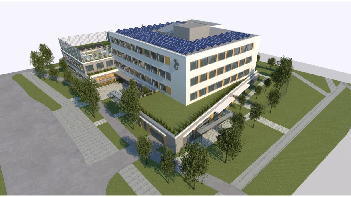 Projekt koncepcyjny zakłada nowoczesne i nieoczywiste rozwiązania architektoniczne i funkcjonalne - boisko sportowe (do koszykówki i piłki nożnej) o nawierzchni poliuretanowej znajdzie się na dachu niższej części budynku. Oprócz tego powstanie sala gimnastyczna.